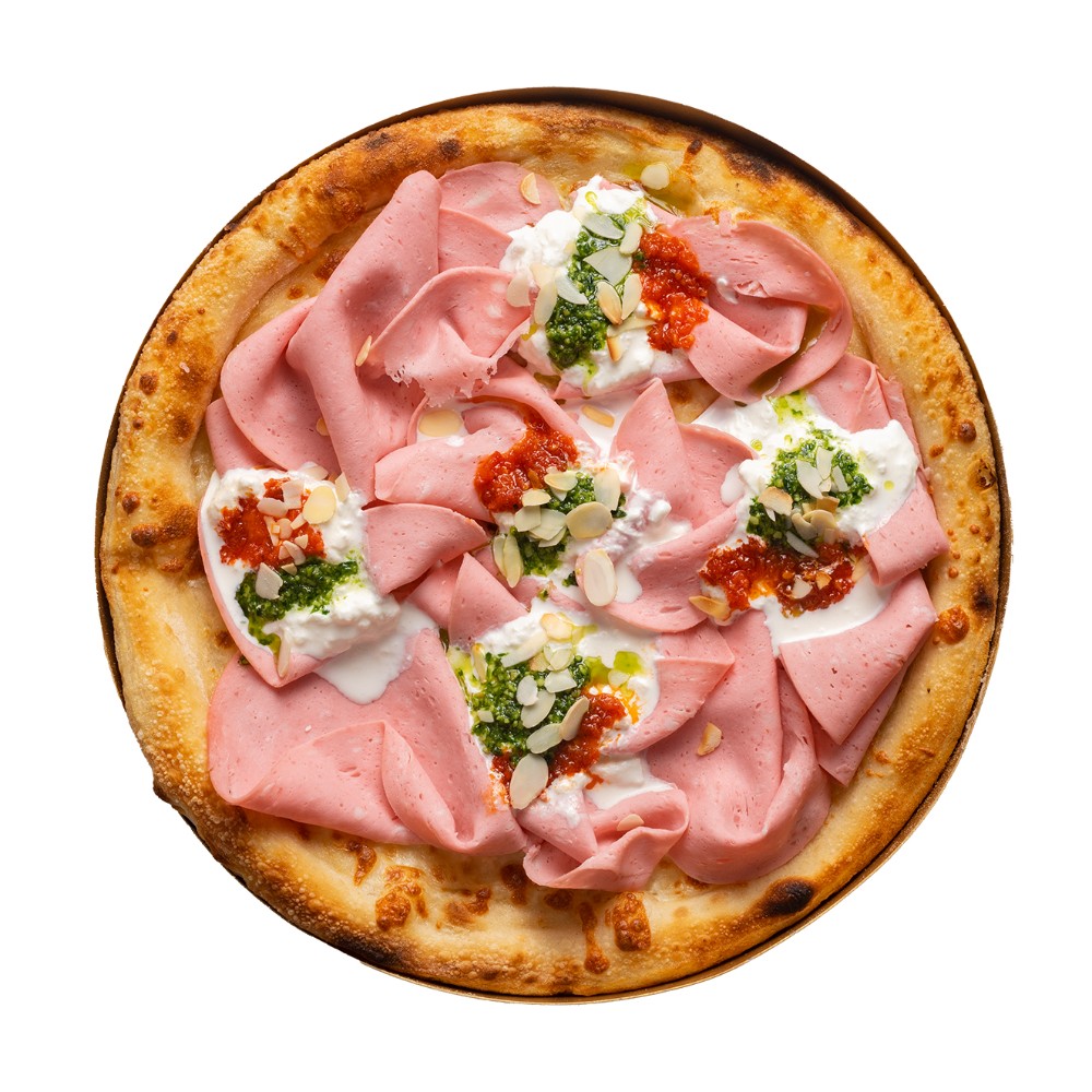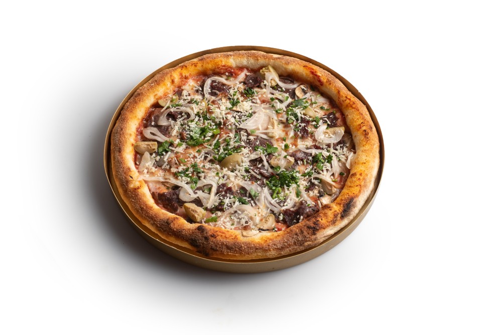 Тісто, томатний соус, фарш телятини, сир моцарела, печериці, маслини каламата, маринована цибуля, пармезан, петрушка, оливкова олія.
